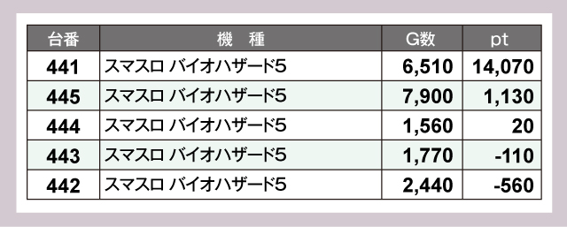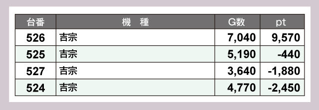 とくにヒートアップしていたのはスロットコーナー。『スマスロ バイオハザード5』441番台が+14,070ptと誰もがうらやむ結果を残していた。そして『吉宗』526番台が+9,570pt、『スマスロ アイドルマスター ミリオンライブ! ネクストプロローグ』430番台が+7,150ptと、かなりの優秀台がひしめき合ったデータになっている。