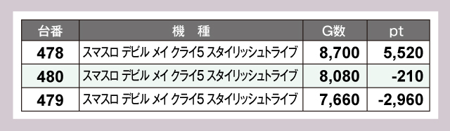『スマスロ デビル メイ クライ5 スタイリッシュトライブ』と『吉宗』に関しては、プラスの台が1台ずつではあるが優秀な成績でカバーし、トータルではプラスにおちついた。