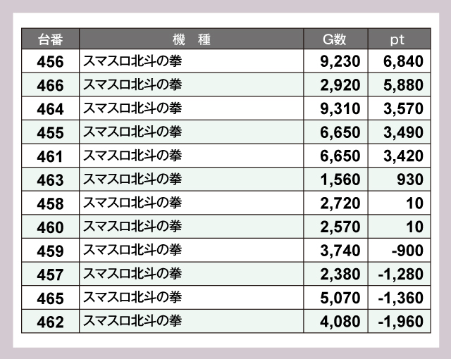 12台設置の『スマスロ北斗の拳』は3,000ptオーバーが5台あらわれ、メイン機種としての実力を示している。