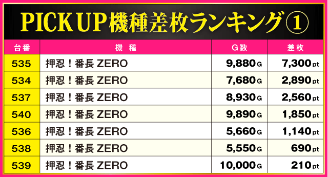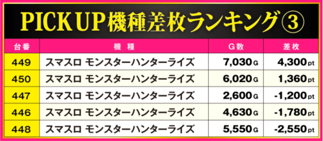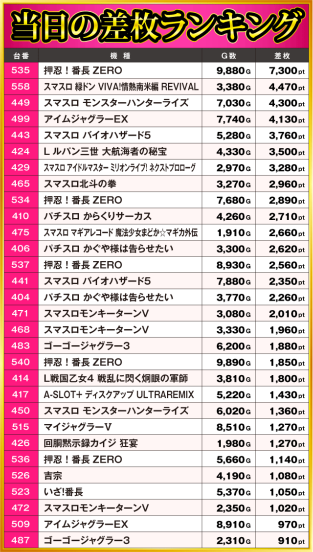 この日、最もプレイヤーの注目を集めていたのが『押忍!番長ZERO』で、535番台が+7,300ptを叩き出しランキングトップに。次いで『スマスロ 緑ドン VIVA!情熱南米編 REVIVAL』や『スマスロ モンスターハンターライズ』など、人気機種を中心に様々な機種から+4,000pt超が飛び出している。