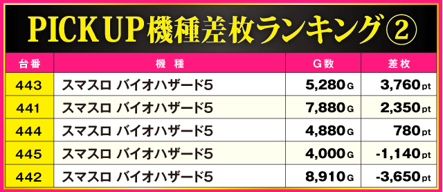 続いていPICK UP機種の状況を見ていこう。『スマスロ バイオハザード5』からは+3,760pt、『スマスロ モンスターハンターライズ』からは+4,300ptを確認。また、ランキングを制した『押忍!番長ZERO』は、全台がプラス差枚となる圧巻の結果を残しファンを喜ばせていた。