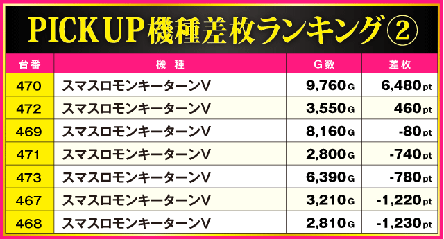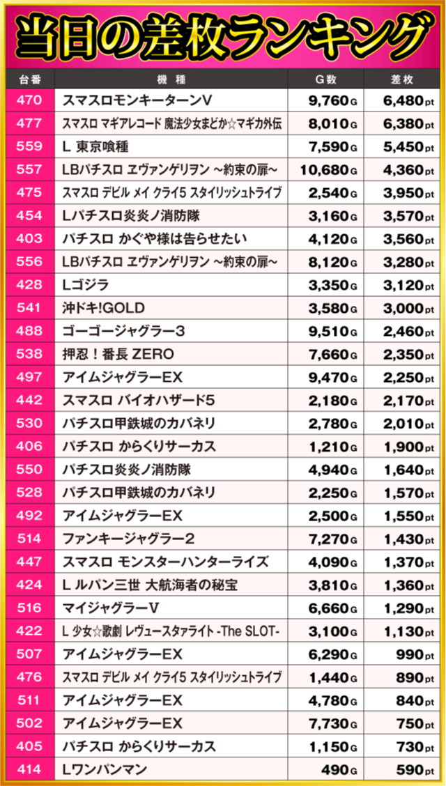 この日は、人気機種を中心に多数の好調台を確認。なかでも『スマスロモンキーターンV』と『スマスロ マギアレコード 魔法少女まどか☆マギカ外伝』が+6,000pt超、『L 東京喰種』が+5,450ptを記録し店内を盛り上げていた。また、ジャグラーシリーズからも好成績が連発し差枚TOP30に8台がランクインしている。