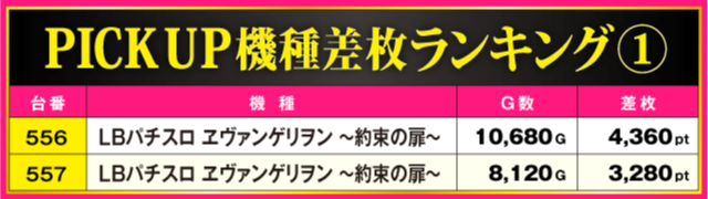 次にPICK UP機種の状況を見ていこう。ハイスコアが飛び出した『スマスロモンキーターンV』と『L 東京喰種』以外に、話題のBT機『LBパチスロ ヱヴァンゲリヲン ~約束の扉~』も大奮闘。556番台が+4,360pt、557番台が+3,280ptと抜群の安定感を披露しファンを喜ばせていた。