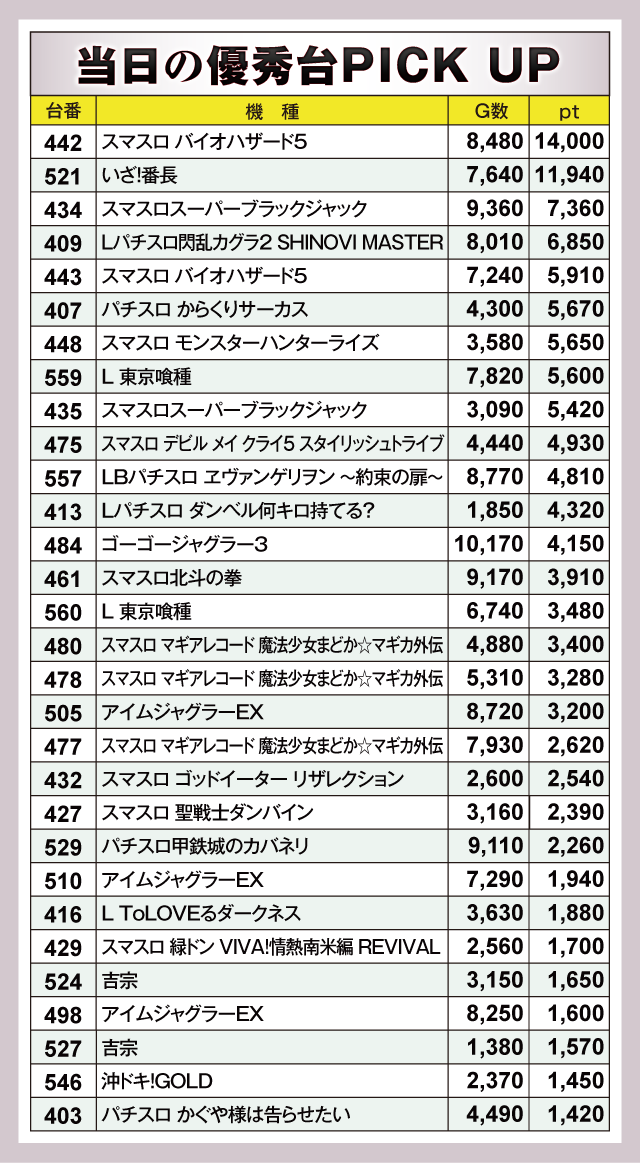 『スマスロ バイオハザード5』442番台が+14,000pt、『いざ!番長』521番台が+11,940ptと、1万ptオーバーが2台並んでいる。そして『スマスロスーパーブラックジャック』434番台が+7,360pt、『Lパチスロ閃乱カグラ2 SHINOVI MASTER』409番台が+6,850ptとつづく。以下、『スマスロ バイオハザード5』443番台の+5,910pt含む5台が5,000ptオーバーなど、優秀台がギッシリ詰まったデータとなっていた。