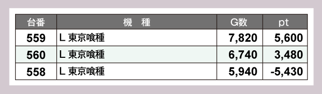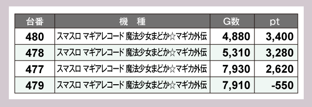 現在人気の『スマスロ マギアレコード 魔法少女まどか☆マギカ外伝』と『L 東京喰種』からは、3,000ptオーバーが2台ずつ確認できた。