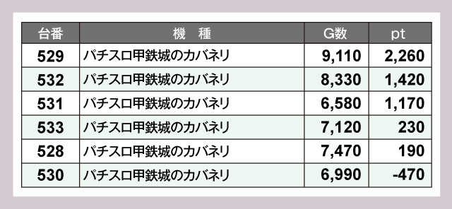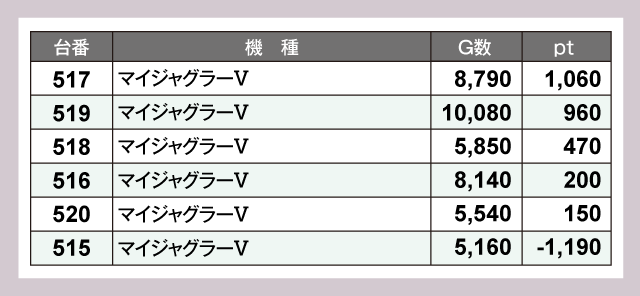 6台設置の『パチスロ甲鉄城のカバネリ』と『マイジャグラーⅤ』は、いずれも5台がプラスpt。安定感を発揮している。