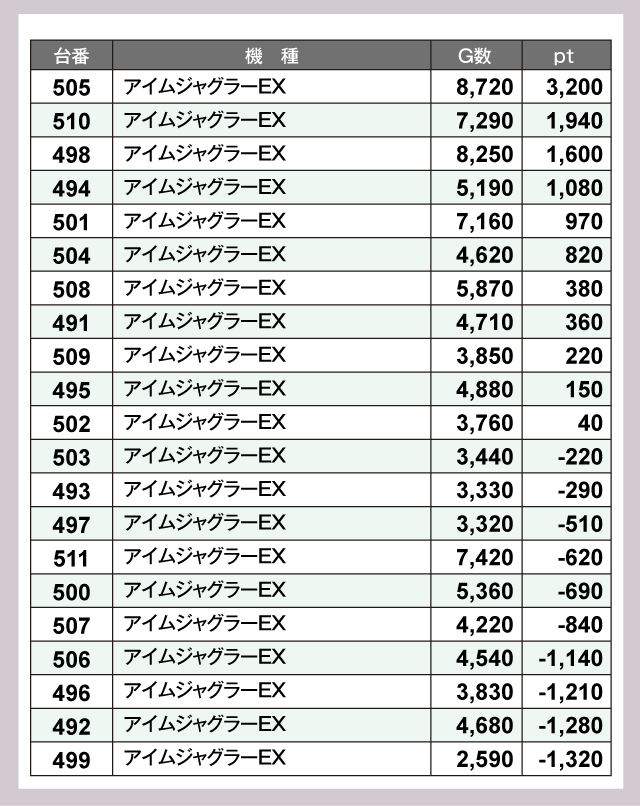 『アイムジャグラーEX』は21台中11台がプラスで、高G数の台も多く、メイン機としての実力を示していた。
