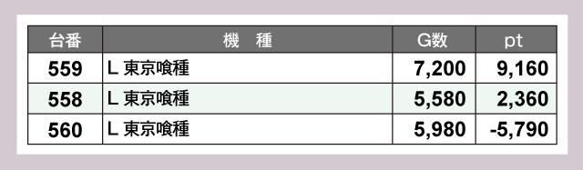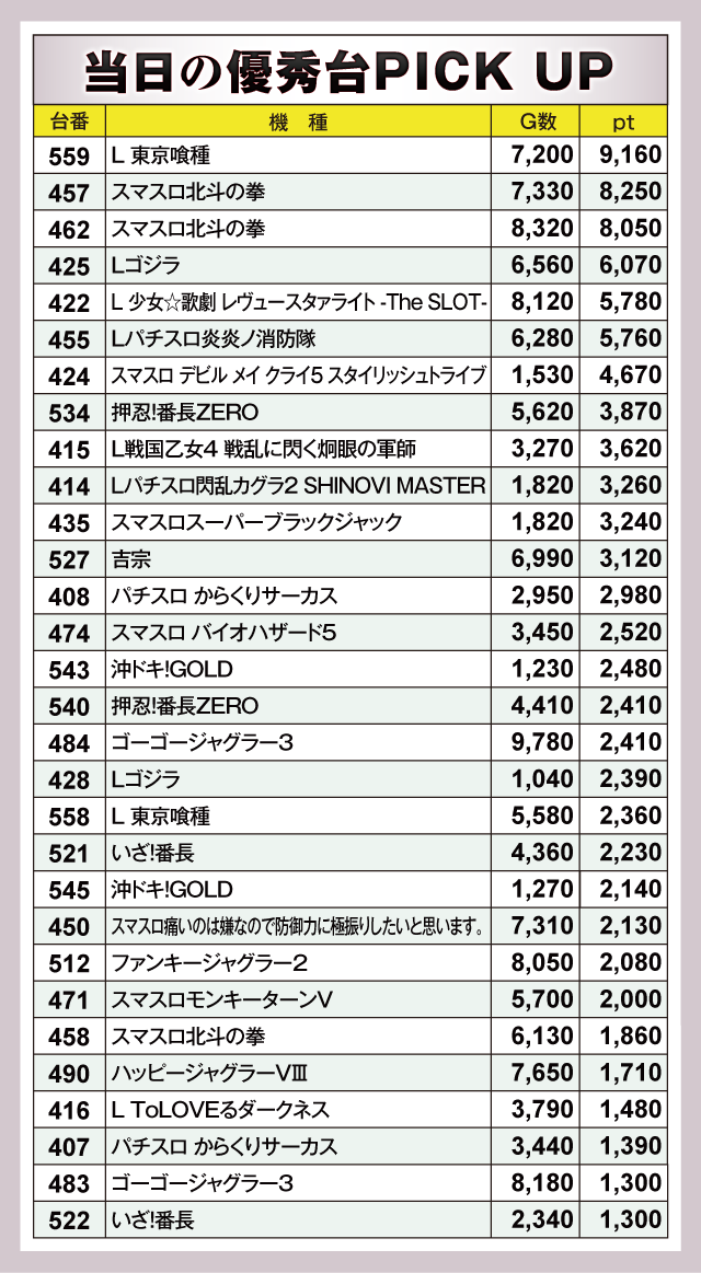 『L 東京喰種』559番台が+9,160ptで、もっとも目立つ活躍をみせてくれた。『スマスロ北斗の拳』457番台が+8,250pt、462番台が+8,050ptでつづく。以下『Lゴジラ』425番台の+6,070pt、『L 少女☆歌劇 レヴュースタァライト -The SLOT-』422番台の+5,780ptなどなど、ファン垂涎の豪華絢爛なデータが仕上がっていた。