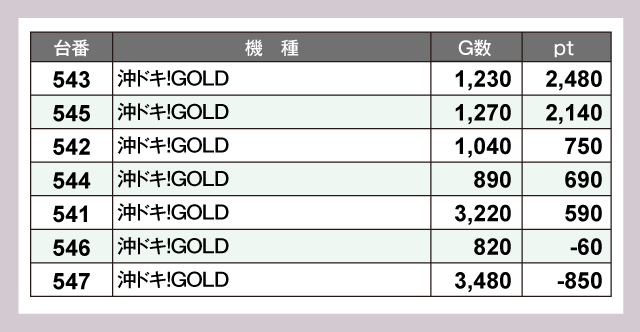 『沖ドキ!GOLD』は全体的に若干、G数が物足りなかった様子。そのポテンシャルを発揮しきれなかった印象だ。