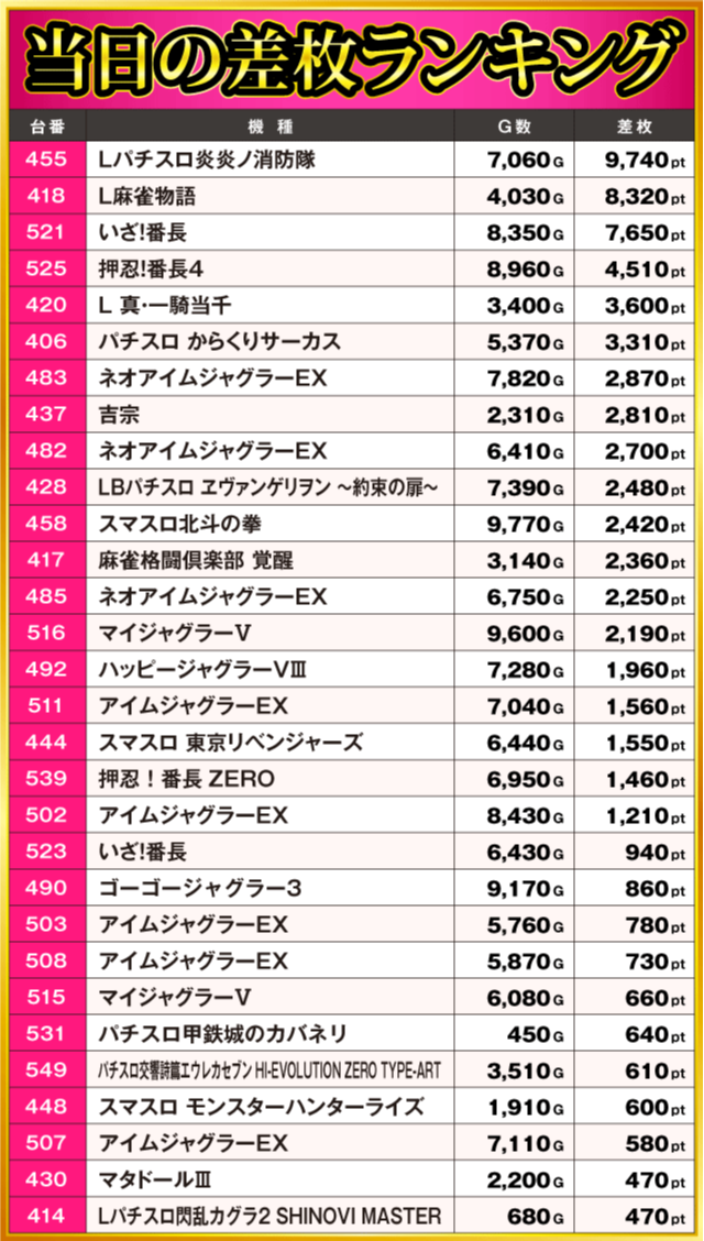 この日、最もプレイヤーの注目を集めたのが『Lパチスロ炎炎ノ消防隊』で、455番台が万枚目前の+9,740ptを叩き出しランキングトップに。次いで『L麻雀物語』が+8,320pt、『いざ!番長』が+7,650ptを記録するなど、人気のスマスロを中心にハイスコアが続出し店内を盛り上げていた。