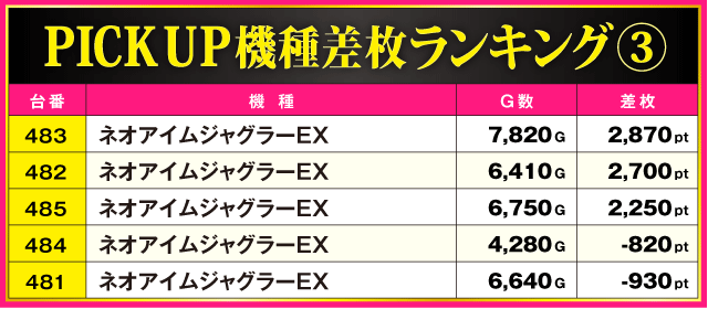 今回のPICK UP機種は全3機種で、ハイスコアを記録した『いざ!番長』以外にも『ネオアイムジャグラーEX』から+2,000pt超が3台も発生するなど多数の好調台を確認。さらに、『スマスロ 東京リベンジャーズ』も半数の台がプラス差枚で実戦を終えているだけに、それぞれのシマは終日活気に満ち溢れる一日となった。