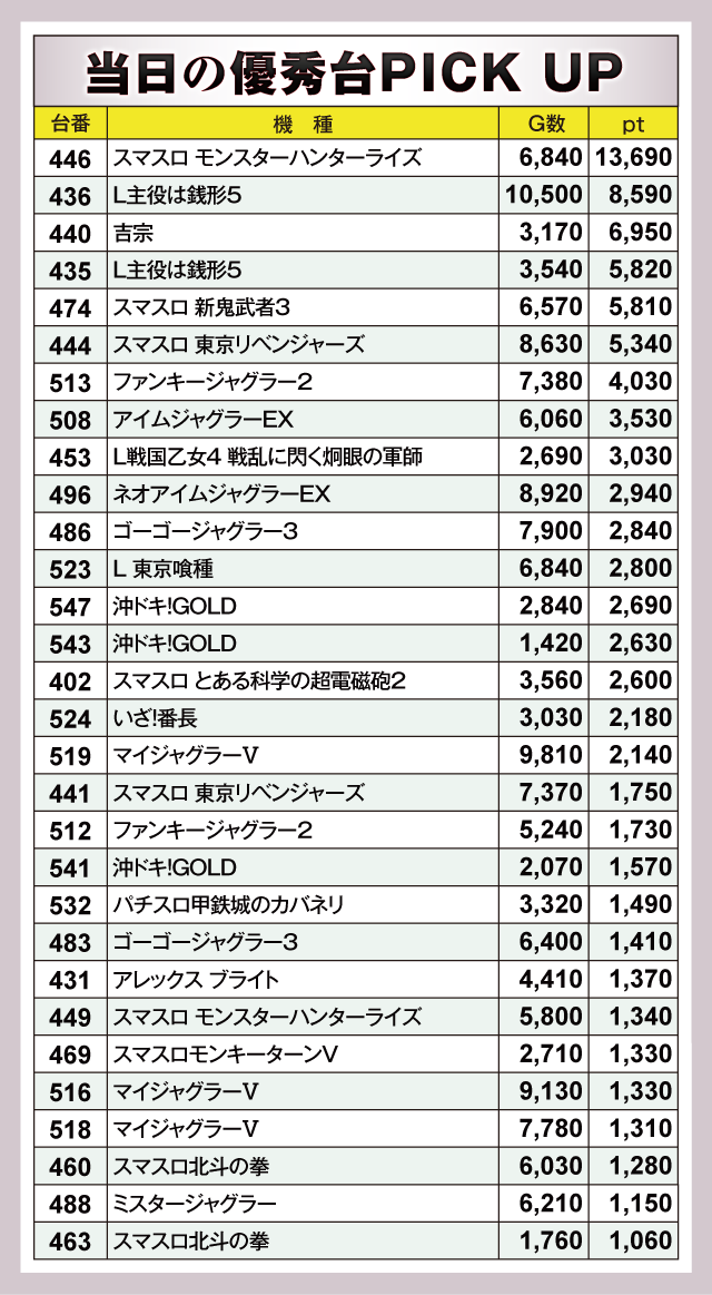 『スマスロ モンスターハンターライズ』446番台が+13,690ptと、頭ひとつ飛びぬけた成績で結果をのこしていた。そして『L主役は銭形5』436番台が+8,590pt、435番台が+5,820pt、『吉宗』440番台が+6,950ptでつづく。さらに『スマスロ 新鬼武者3』474番台の+5,810pt、『スマスロ 東京リベンジャーズ』444番台の+5,340ptなどなど、かなりの優秀台がズラリと並ぶ見事なデータとなっていた。