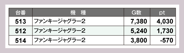 『ファンキージャグラー2』と『マイジャグラーⅤ』はどちらも高稼働で、優秀台も多数誕生。安定感を存分にアピールしている。