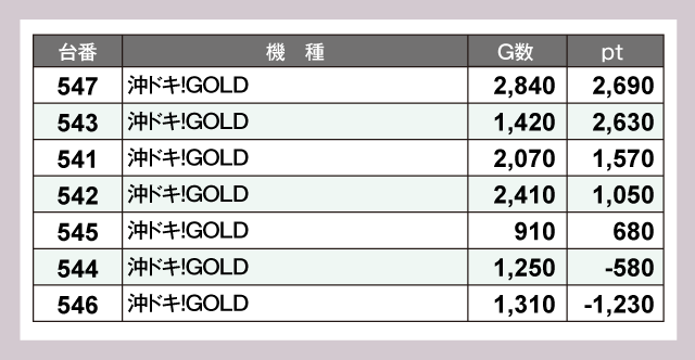 7台設置の『沖ドキ!GOLD』は5台がプラスpt。G数を見るに、まだまだ伸びしろはありそうだ。