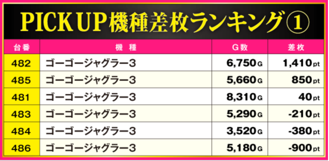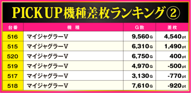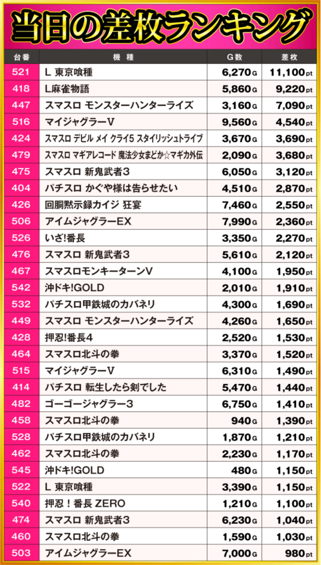 この日は、『L 東京喰種』が万枚超の+11,100ptを叩き出しランキングトップに。次いで『L麻雀物語』が+9,220pt、『スマスロ モンスターハンターライズ』が+7,090ptを記録している。さらに、『マイジャグラーⅤ』の+4,540ptを筆頭にジャグラーシリーズの活躍も目立っていた。