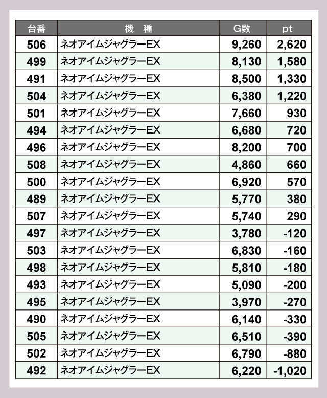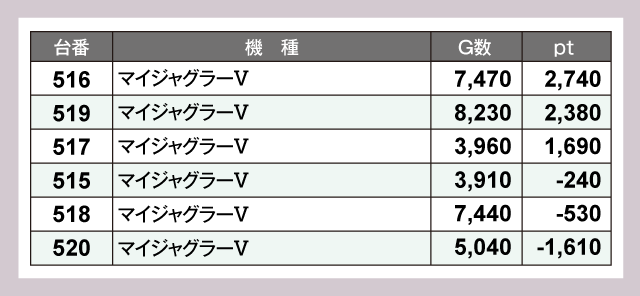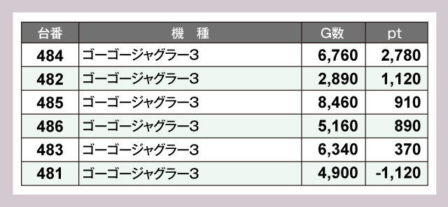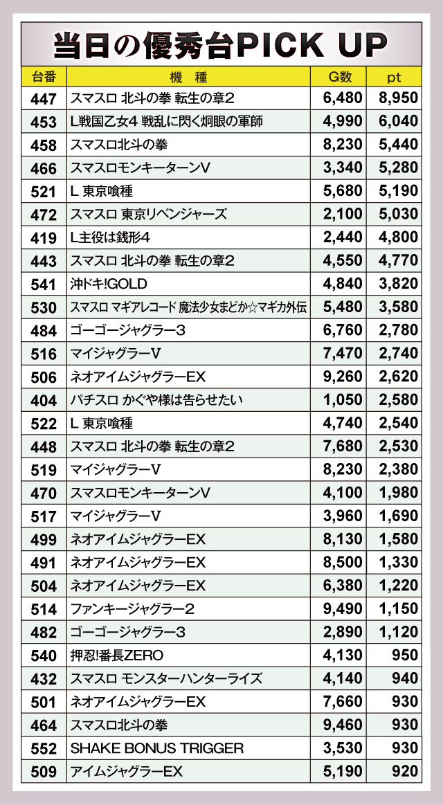 『スマスロ 北斗の拳 転生の章2』447番台が+8,950ptと、最も大きな成果をあげていた。そして『L戦国乙女4 戦乱に閃く炯眼の軍師』453番台が+6,040ptでつづく。以下『スマスロ北斗の拳』458番台含む5,000ptオーバー4台、『L主役は銭形4』419番台含む4,000ptオーバー2台など、優秀台があちこちのシマで誕生していた。