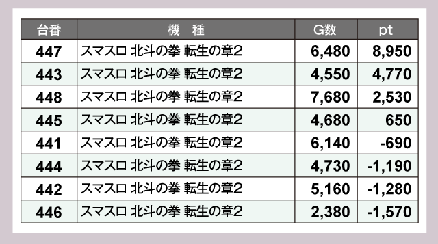 『スマスロ 北斗の拳 転生の章2』は8台中4台がプラスptで、トータルでは大きくプラスを叩きだしている。