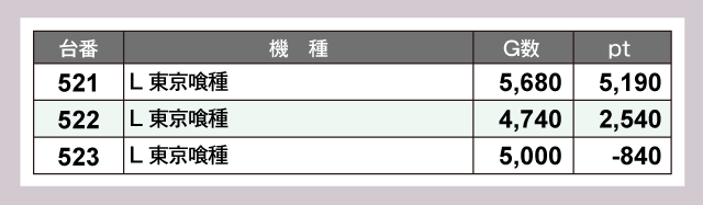 3台設置の『L 東京喰種』は2台がプラスpt。安定して実力を発揮していたようだ。