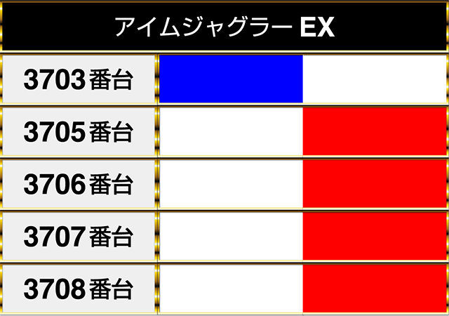 『アイムジャグラーEX』は3705番台から3708番台までが並んでプラスpt!!