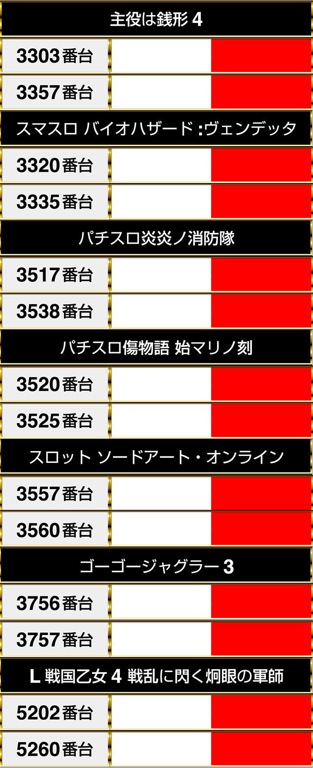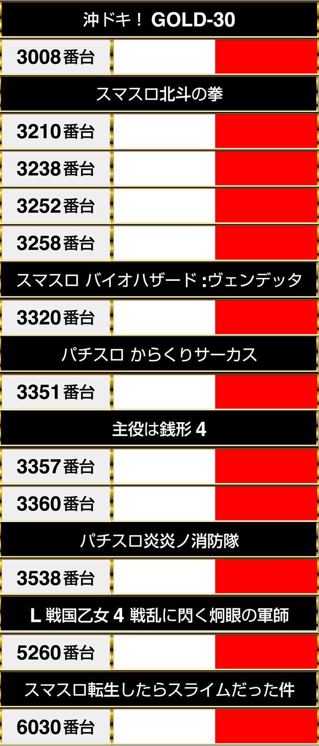 『パチスロ炎炎ノ消防隊』の3538番台や『スマスロ転生したらスライムだった件』の6030番台などもプラスptでこの日を終えた。