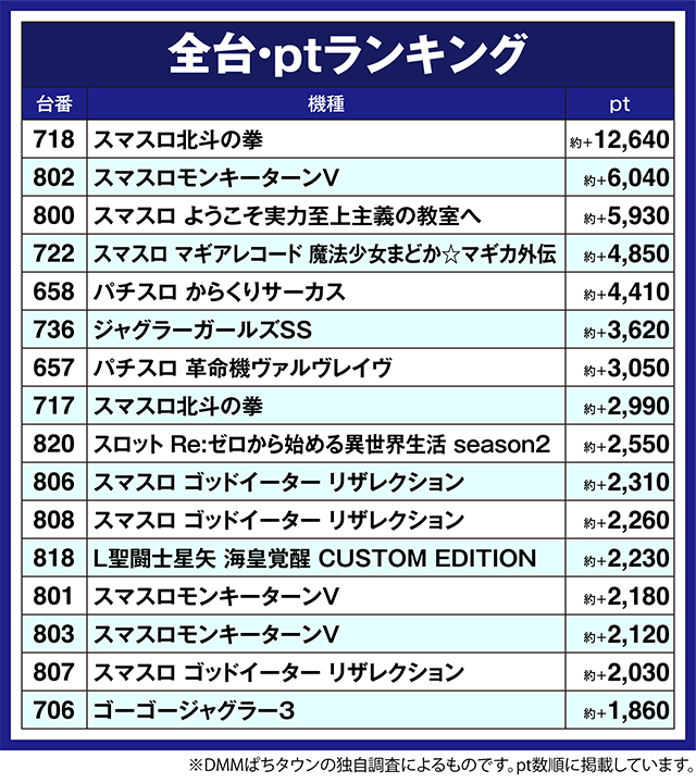 「スマスロ マギアレコード 魔法少女まどか☆マギカ外伝」の722番台と「パチスロ からくりサーカス」の658番台も約+4,400pt以上を記録した。