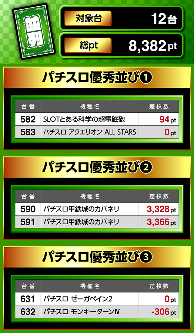 並列の総ptは8,000ptオーバー。590番台と591番台の「パチスロ甲鉄城のカバネリ」に3,300pt以上が並んだ。
