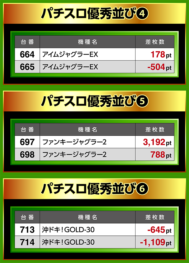 697番台と698番台の「ファンキージャグラー2」にプラスが続き、3,100ptを超えた台もあった。