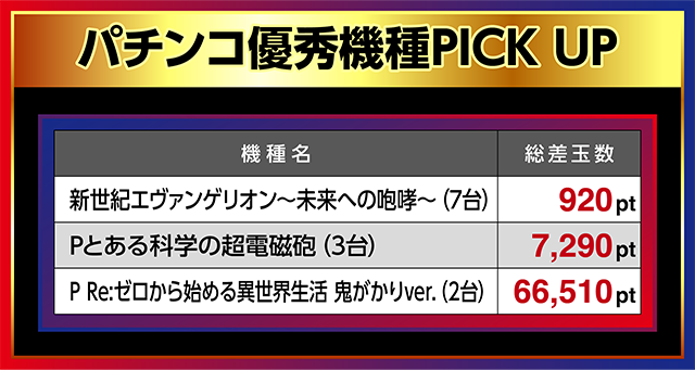 2台設置の「P Re:ゼロから始める異世界生活 鬼がかりver.」は全台が16,000ptを上回り、120番台は49,910ptとなった。