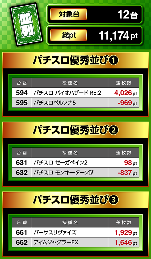 4,000ptを超えた594番台の「パチスロ バイオハザード RE:2」と595番台の「パチスロペルソナ5」など、並列は6ヶ所。