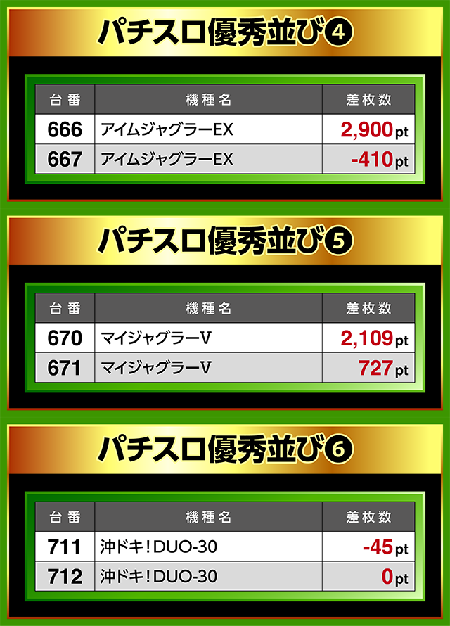 「アイムジャグラーEX」では、666番台が2,900ptを記録。