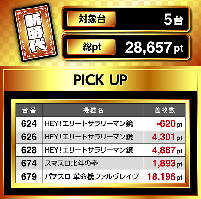 増台された「HEY!エリートサラリーマン鏡」では、626番台と628番台が4,300ptを超えた。