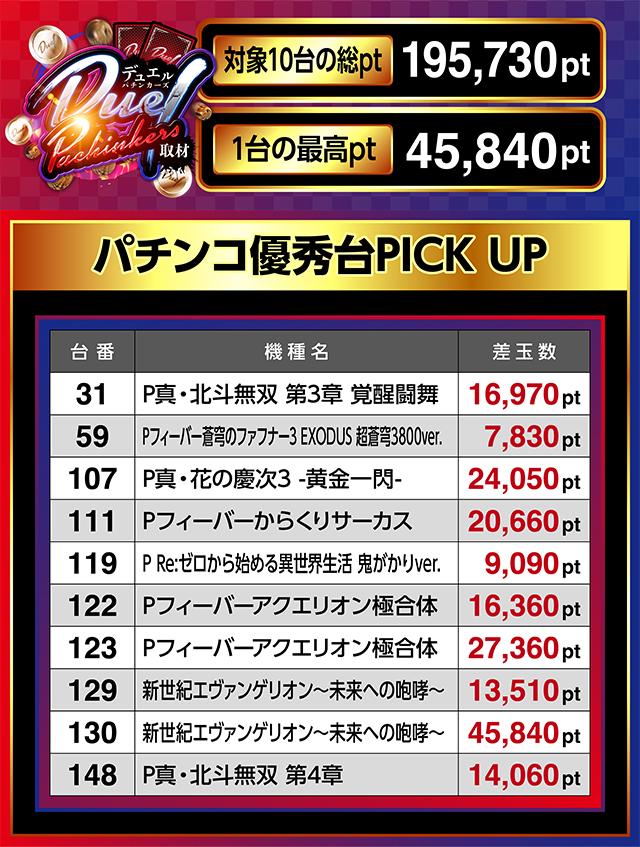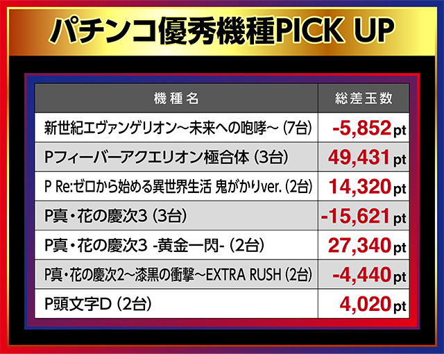 ほかにも、「P真・花の慶次3 -黄金一閃-」、「Pフィーバーからくりサーカス」、「Pフィーバーアクエリオン極合体」の3機種に20,000ptを超えた台があった。