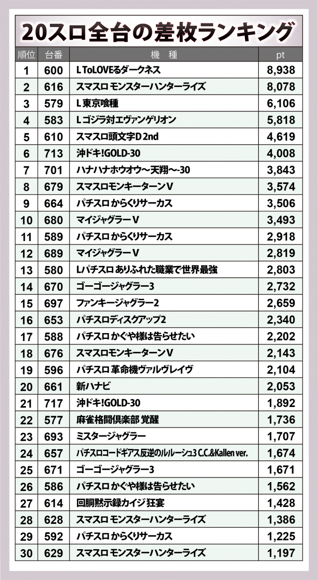 次項で挙げる5機種以外では、+8千9百超の『L ToLOVEるダークネス』を頂点に、『L 東京喰種』が+6千1百超、『L ゴジラ対エヴァンゲリオン』が+5千8百超、『スマスロ頭文字D 2nd』が+4千6百超、『沖ドキ!GOLD-30』が+4千超と、スマスロ・沖スロが上位を占めていた。