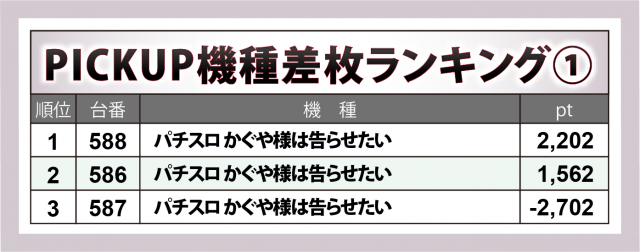 上から順に述べていくと、『スマスロ モンスターハンターライズ』に+8千1百弱、『パチスロ からくりサーカス』に+2千9百超、『ゴーゴージャグラー3』に+2千7百超、『パチスロ かぐや様は告らせたい』に+2千2百超、『パチスロ 革命機ヴァルヴレイヴ』に+2千1百超と、人気のSANKYOスマスロやボーナスタイプが実力を発揮した。