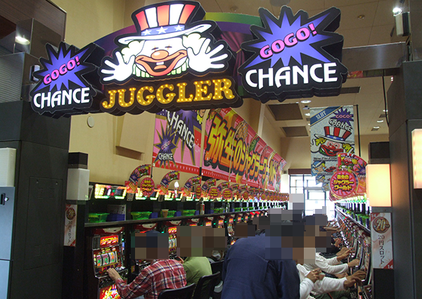 シマの入り口にある大きな装飾も特徴的なジャグラーシリーズにも、空き台はほとんどみられない。