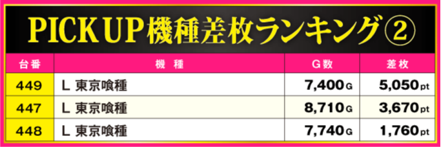 次にPICK UP機種の状況を見ていこう。万枚超を記録した『いざ!番長』以外では、『吉宗』から+9,390pt、『L 東京喰種』からは+5,050ptといった好成績が発生。しかも、3機種トータルの全10台中8台がプラス差枚となっているだけに、それぞれのシマは常に活気に包まれていた。