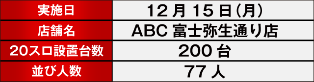 12月15日「ABC富士弥生通り店 」にて「SLOTIMES~その瞬間を伝えたい~」が開催。今回はABCグループ33店舗で同時に行われ、各店舗では朝から大勢のプレイヤーが集まり開店を迎えていた。はたして、店内ではどのような盛り上がりを見せてくれたのか? 早速、当日の様子を詳細データとともに徹底レポートしていこう。