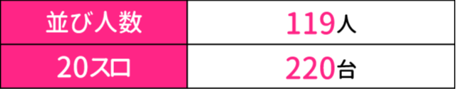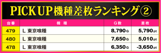 続いてPICK UP機種の状況をチェックしていくと、差枚上位にランクインした『L 東京喰種』以外にも『スマスロ鉄拳6』から+3,230pt、『いざ!番長』から+5,190ptが発生。しかも、3機種トータルの全12台中9台がプラス差枚となっているだけに、それぞれのシマは常に活気に満ち溢れる一日となった。
