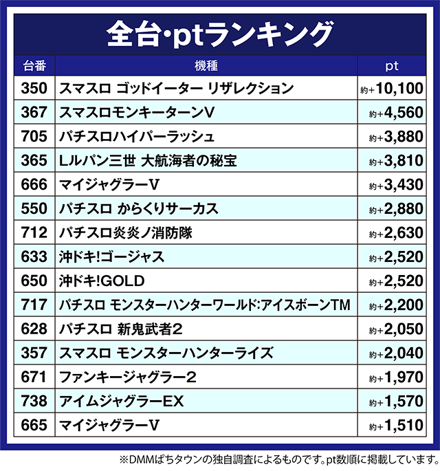 「ファンキージャグラー2」の671番台と「アイムジャグラーEX」の738番台も約+1,500pt以上と、多彩な機種が盛り上がりをみせた。