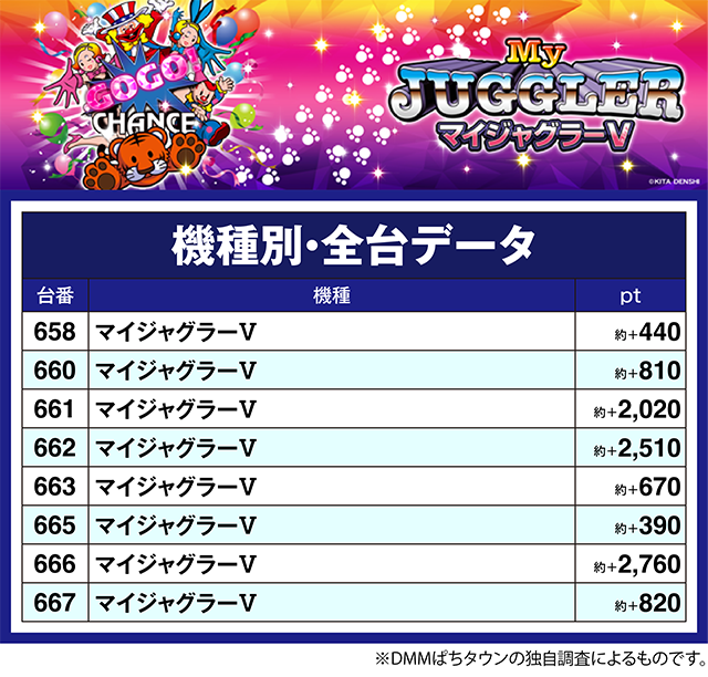 「ゴーゴージャグラー3」にも結果を残した台があり、675番台が約+2,500ptを超えた。