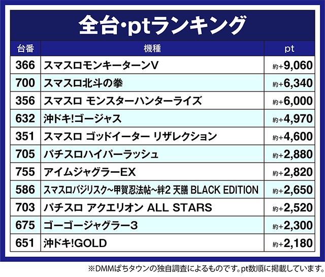 「スマスロ北斗の拳」の700番台と「スマスロ モンスターハンターライズ」の356番台も約+6,000pt以上を記録した。