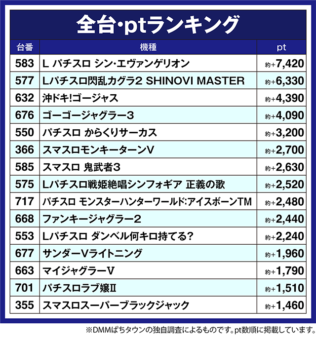 ほかにも、「沖ドキ!ゴージャス」の632番台や「ゴーゴージャグラー3」の676番台などが約+4,000ptオーバー。