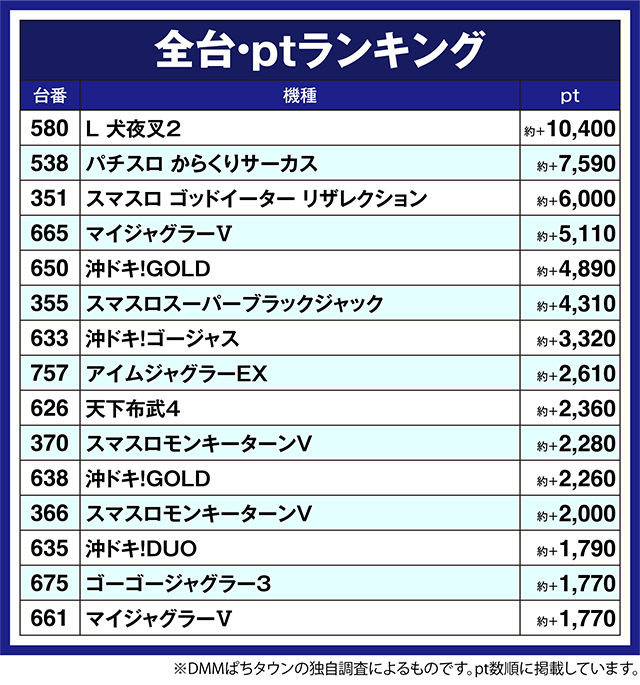 「ゴーゴージャグラー3」も活気は大きく、675番台が約+1,770ptを記録した。
