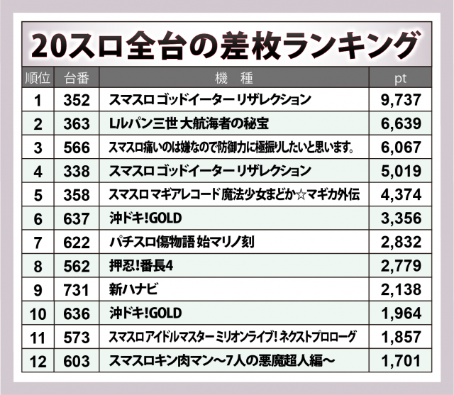 下で述べる好調機種以外では、『Lルパン三世 大航海者の秘宝』に+6,600枚超、『スマスロ痛いのは嫌なので防御力に極振りしたいと思います。』に+6,100枚弱、『スマスロ マギアレコード 魔法少女まどか☆マギカ外伝』に+4,400枚弱、『沖ドキ!GOLD』に+3,400枚弱・+2,000枚弱となった他、スマスロ・メダル機どちらにもハイスコアが飛び出した。