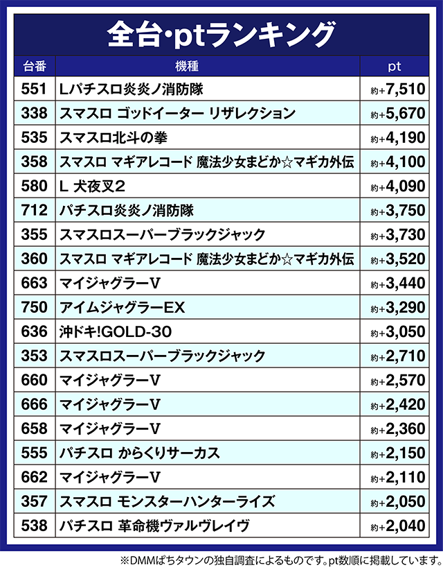 ほかにも、「スマスロ北斗の拳」の535番台や「スマスロ マギアレコード 魔法少女まどか☆マギカ外伝」の358番台などが約+4,000ptを超えた。