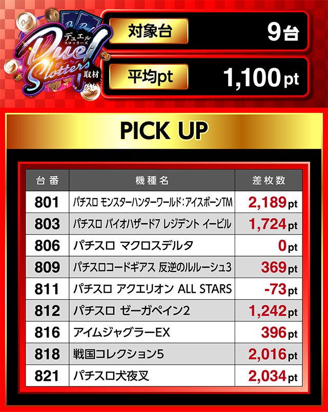 ほかにも、803番台の「パチスロ バイオハザード7 レジデント イービル」は1,700pt以上、812番台の「パチスロ ゼーガペイン2」も1,200pt超と、いくつもの台が結果を残した。