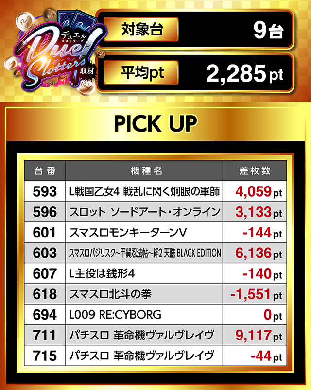 596番台の「スロット ソードアート・オンライン」も3,100ptを上回った。