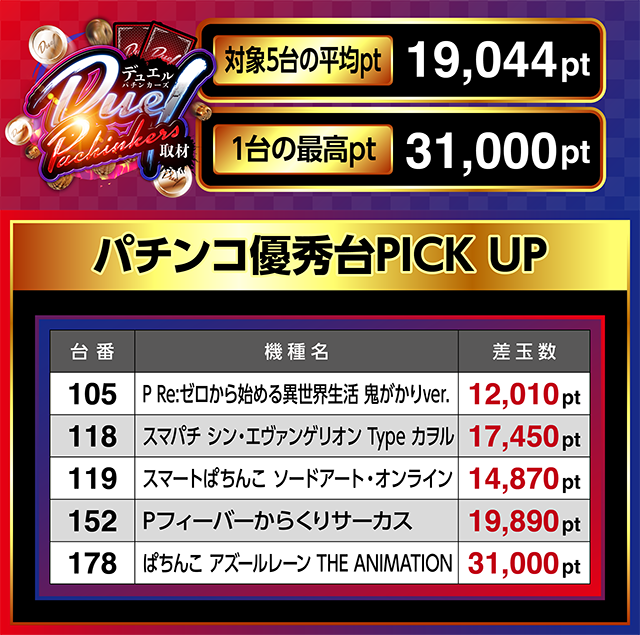 119番台の「スマートぱちんこ ソードアート・オンライン」と105番台の「P Re:ゼロから始める異世界生活 鬼がかりver.」も12,000ptを超えた。