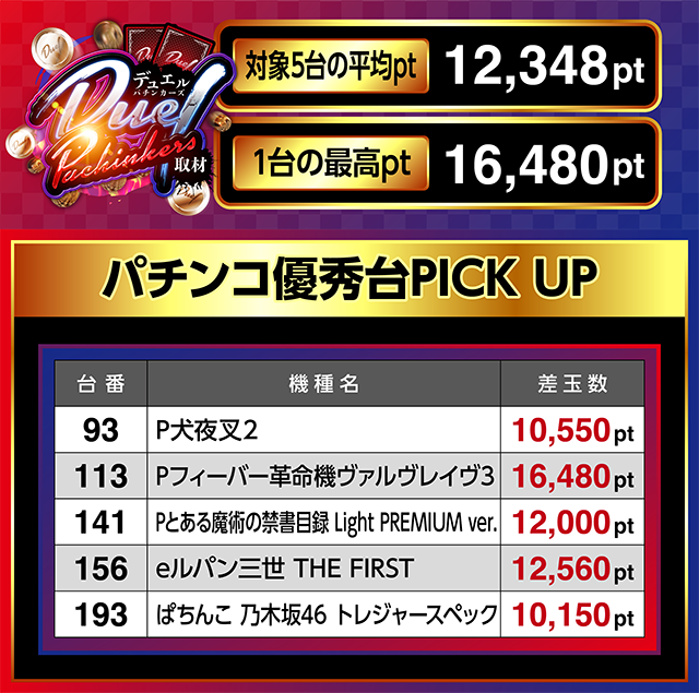 パチンコには10,000ptを超えた台が多く、「Pフィーバー革命機ヴァルヴレイヴ3」に16,000ptを上回った台があった。