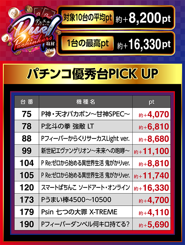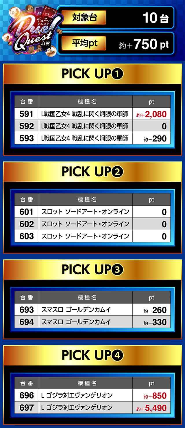 パチスロでは「L ゴジラ対エヴァンゲリオン」の697番台が約+5,490ptとなり、パチンコは「スマートぱちんこ ソードアート・オンライン」に+16,000ptを超えた台があった。